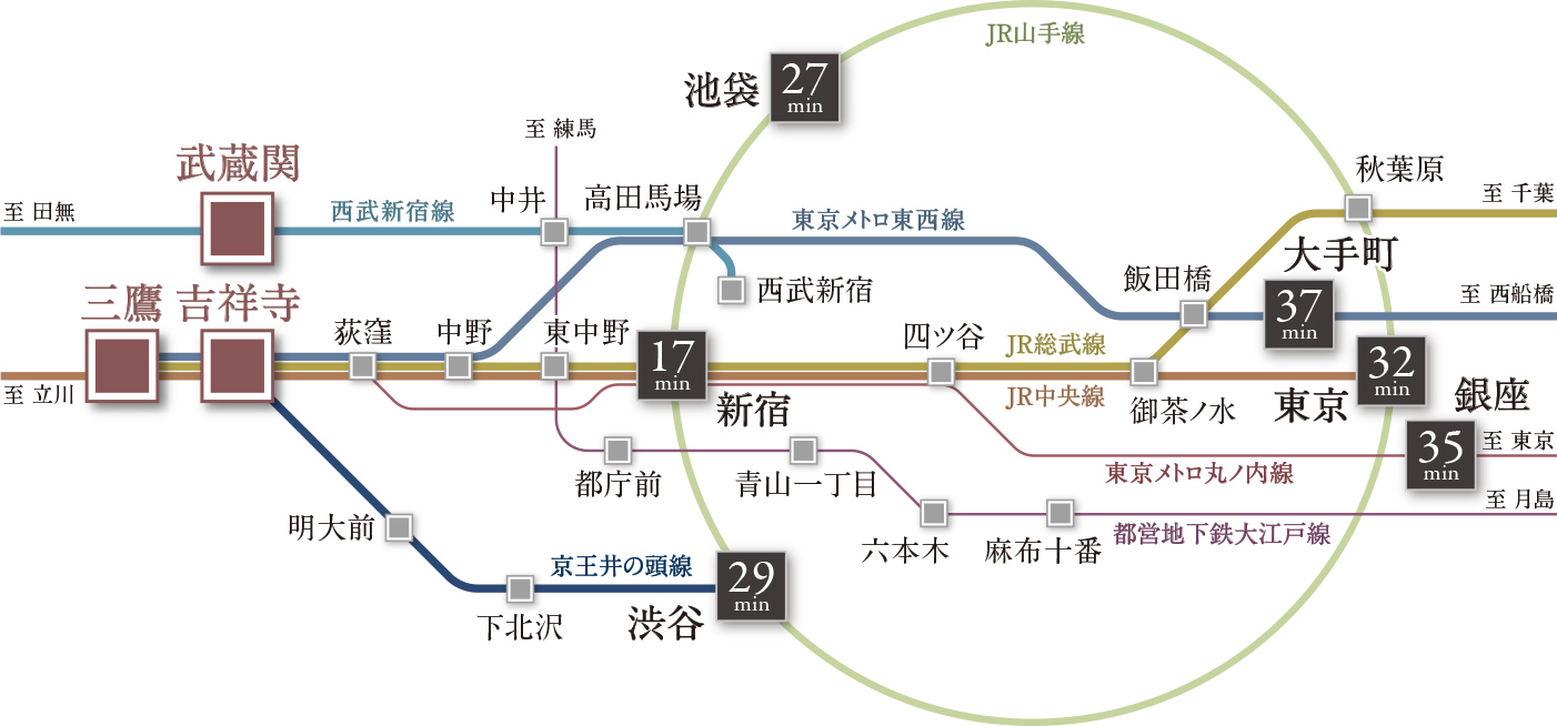 ※1.西武新宿線・東京メトロ東西線・JR総武線・JR中央線・京王井の頭線 ◎「池袋」駅へ26分(日中時27分)JR中央線快速利用、「新宿」駅でJR山手線に乗り換え。◎「銀座」駅へ34分(日中時35分)JR中央線快速利用、「四ツ谷」駅で東京メトロ丸ノ内線に乗り換え。※所要時間は通勤時、( )内は日中平常時のもので乗換え、待ち時間等は含みません。また、時間帯により多少異なります。
