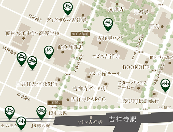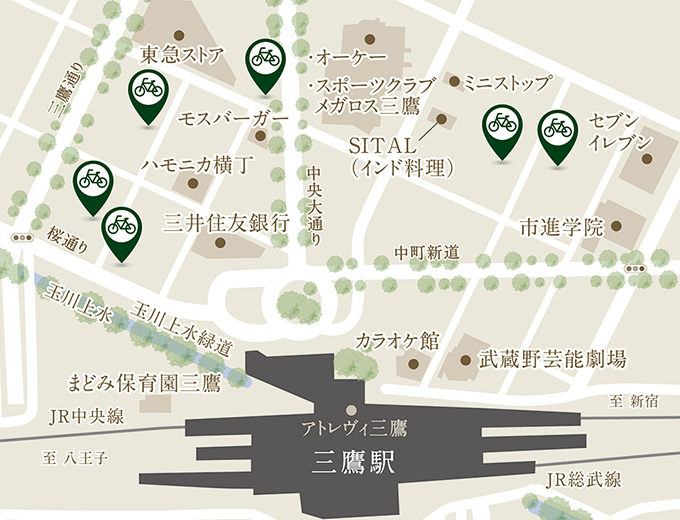 JR中央線「吉祥寺」駅・「三鷹」駅周辺は駐輪場も多く、通勤や通学には自転車でのアクセスも便利。